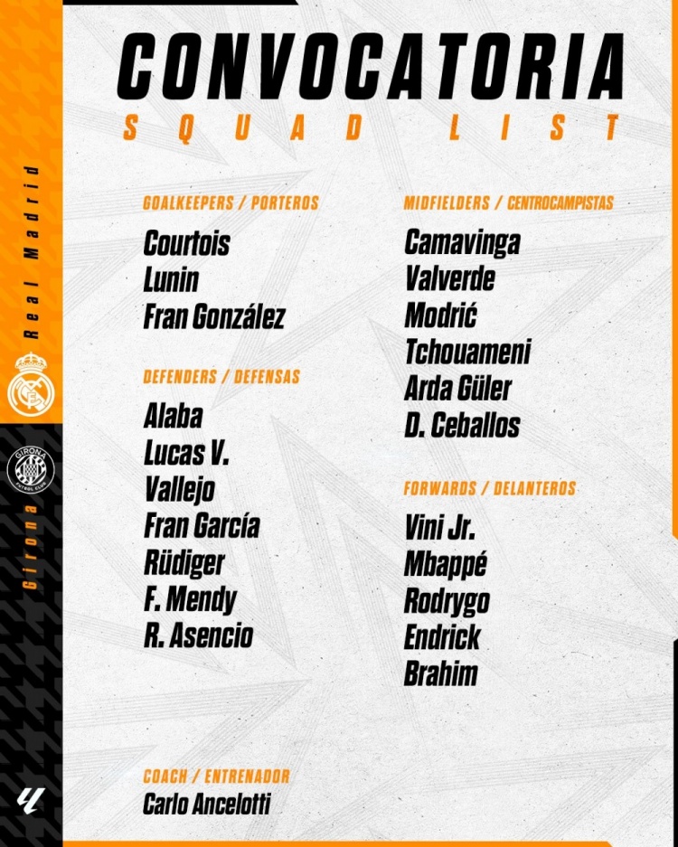 2月22日訊 北京時(shí)間明晚23:15,皇馬將在西甲第25輪中迎戰(zhàn)赫羅納。賽前,皇馬公布了將出戰(zhàn)本場比賽的大名單。其中,貝林厄姆因染紅停賽,姆巴佩、維尼修斯領(lǐng)銜,巴斯克斯、阿拉巴、呂迪格等人入選。