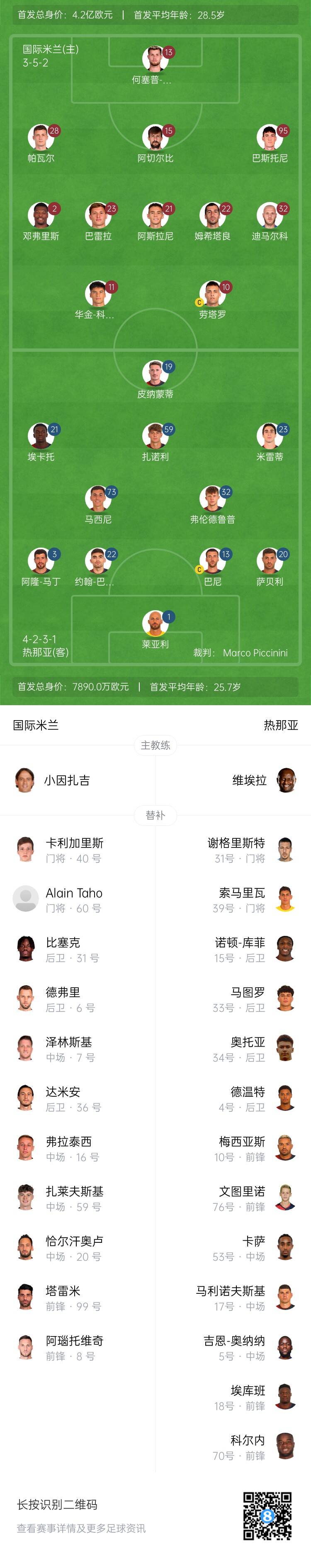 熱那亞首發(fā):1-尼科拉-萊亞利、20-薩貝利、13-巴尼、22-J-巴斯克斯、3-阿隆-馬丁、32-弗倫德盧普、73-馬斯尼、23-米雷蒂、59-薩諾里、21-埃卡托、19-皮納蒙蒂