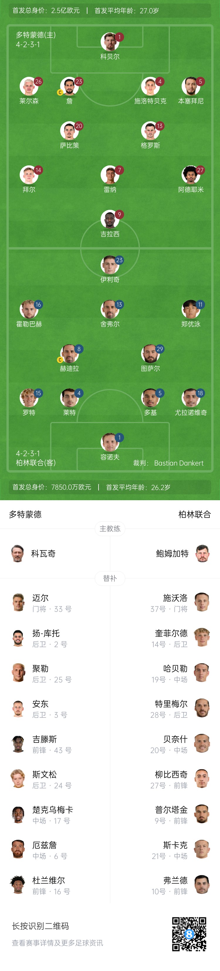 多特首發(fā):1-科貝爾、26-萊爾森、23-埃姆雷-詹 、4-施洛特貝克、5-本塞拜尼 、20-薩比策、 13-格羅斯 、14-拜爾 、7-雷納、27-阿德耶米、9-吉拉西