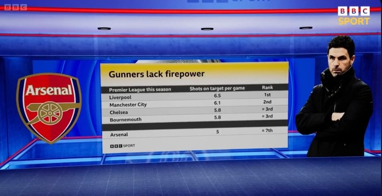 BBC也盤(pán)點(diǎn)了本賽季英超球隊(duì)場(chǎng)均射正次數(shù)榜,利物浦6.5次居首,曼城6.1次第二,切爾西與伯恩茅斯5.8次并列第三,而阿森納5次僅能夠并列排在第7。