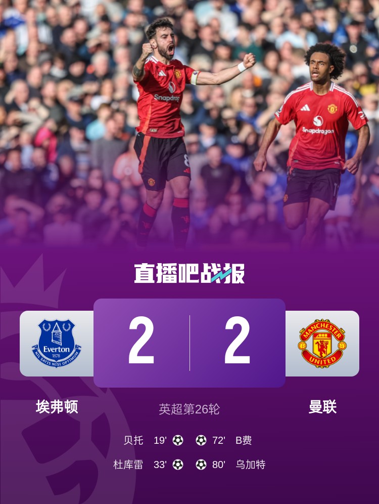英超聯(lián)賽第26輪,曼聯(lián)2-2戰(zhàn)平埃弗頓,B費、烏加特進球。