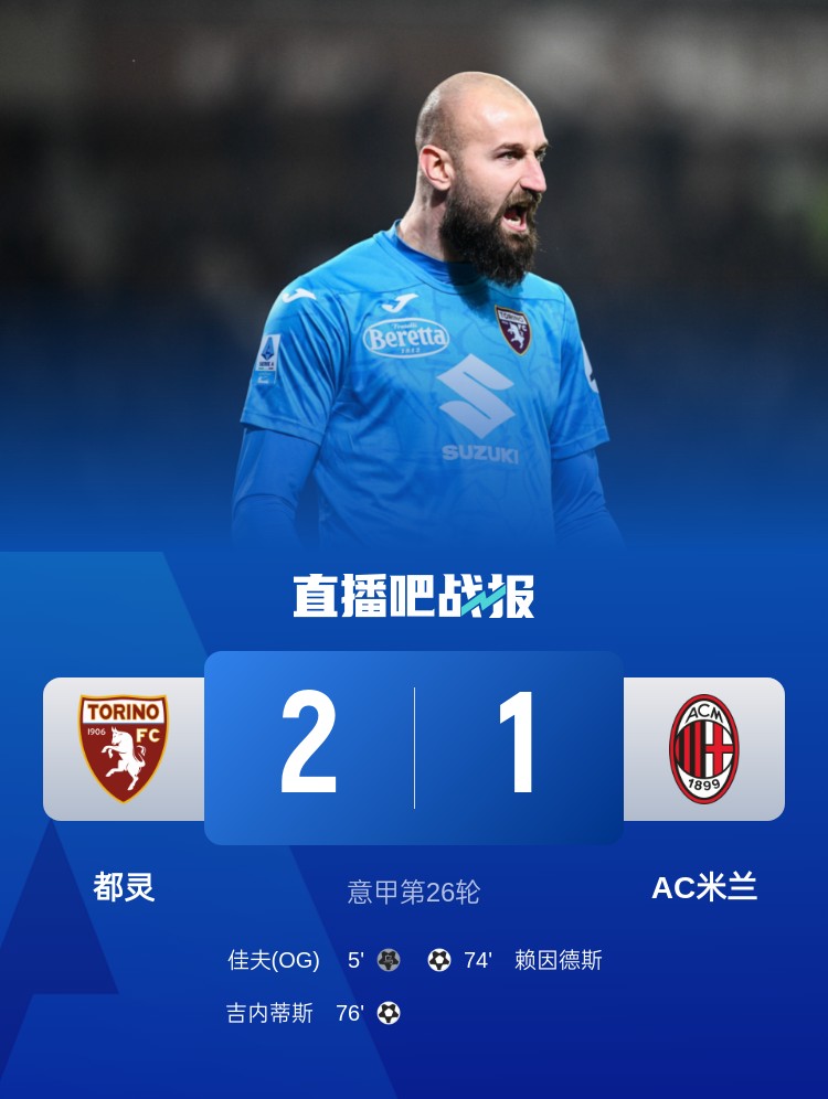 意甲第26輪,AC米蘭客場1-2不敵都靈,佳夫烏龍球,都靈門將瓦尼亞發(fā)揮出色。