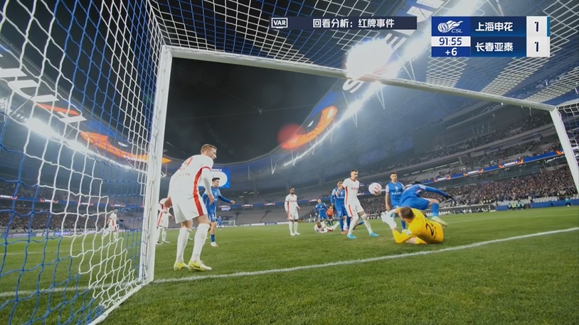 上海申花主場(chǎng)交鋒長春亞泰的新賽季中超揭幕戰(zhàn),傷停補(bǔ)時(shí)階段,申花隊(duì)員朱辰杰的頭球攻門導(dǎo)致吳亞珂撲救脫手,蔣圣龍上搶時(shí)略顯魯莽,一腳結(jié)結(jié)實(shí)實(shí)踩在吳亞珂小腿上。這個(gè)疑似紅牌的動(dòng)作,引發(fā)視頻助理裁判VAR介入,但當(dāng)值主裁判李海新在觀看回放后,否決了VAR的紅牌判罰建議,只是給了蔣圣龍一張黃牌。