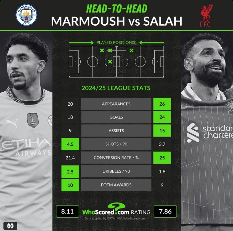 2月23日訊 本輪英超將迎來(lái)曼城與利物浦的焦點(diǎn)對(duì)話,也是兩位埃及前鋒薩拉赫、馬爾穆什首次在英超交鋒,數(shù)據(jù)網(wǎng)站W(wǎng)hoscored對(duì)比了本賽季兩人在聯(lián)賽中的數(shù)據(jù),具體如下: