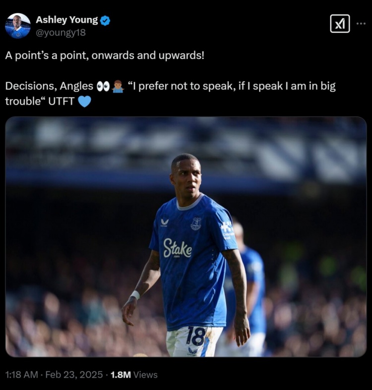 2月23日訊 本輪英超比賽中,埃弗頓2-2戰(zhàn)平曼聯。比賽尾聲階段,阿什利-揚在德里赫特和馬奎爾的包夾下倒地,裁判最初判罰點球,但在場邊觀看VAR后取消。賽后,阿什利-揚更新社媒,引用了穆帥的名言,似乎是對判罰不滿。