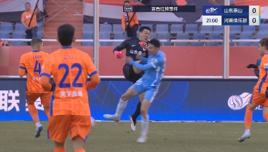 比賽第23分鐘,河南隊長傳,王大雷沖出禁區(qū)解圍沒踢到球,踢翻了劉鑫瑜,主裁一開始出示黃牌,隨后去場邊查看VAR,取消黃牌,將王大雷直紅罰下!