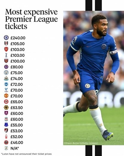 [4] TA列英超球隊(duì)票價(jià)排名:切爾西240磅最貴,頭尾相差五倍多. . 2023年8月24日.