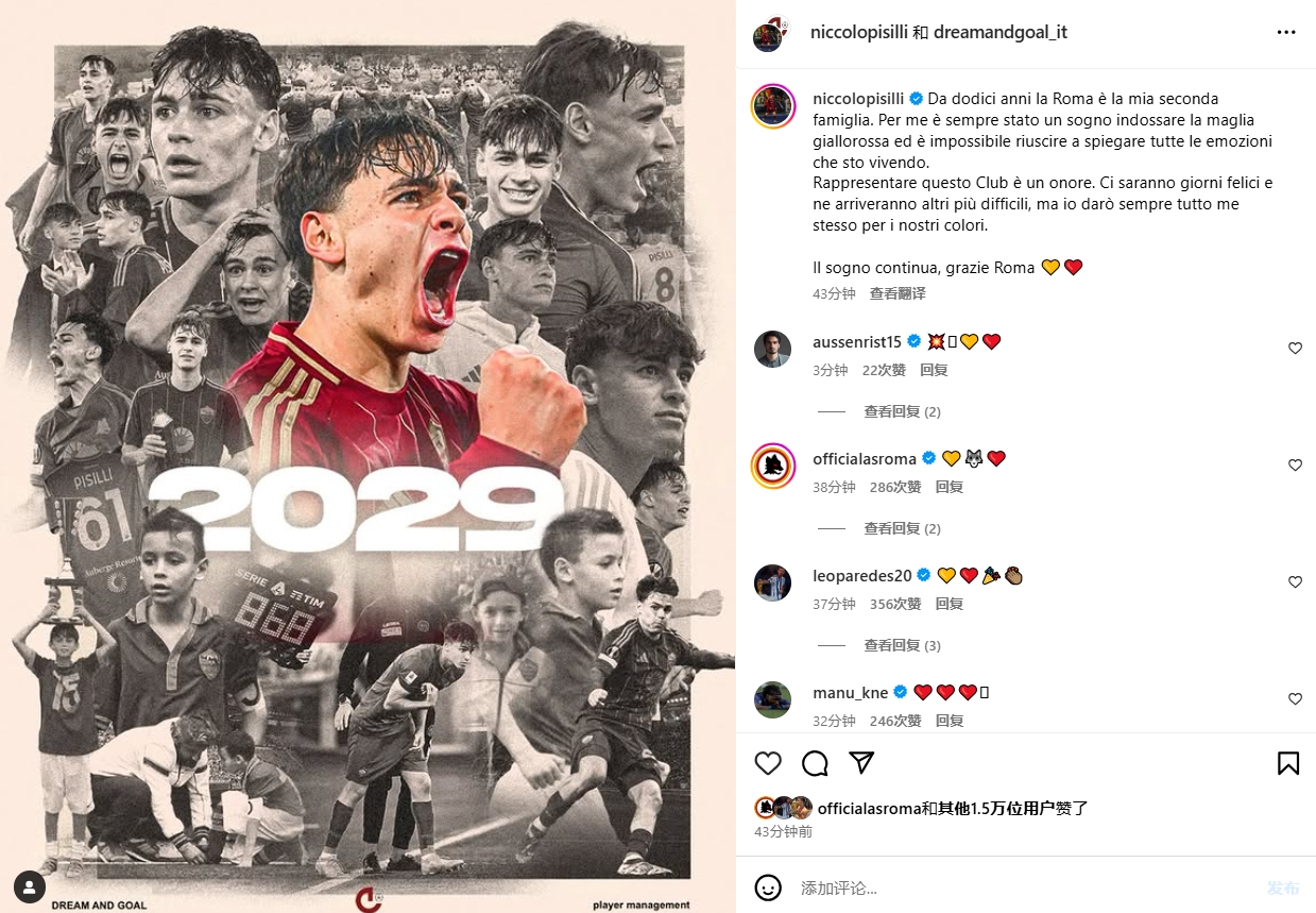 在續(xù)約官宣后皮西利更新了社媒,曬出自己續(xù)約成功的海報(bào),并配文寫道:“這12年來,羅馬一直是我第二個(gè)家,穿上羅馬球衣一直是我的夢(mèng)想,現(xiàn)在我激動(dòng)的心情難以言述。能夠代表羅馬出戰(zhàn),我感到非常榮幸,雖然一路走來有歡笑,也有苦澀,但我會(huì)為了球隊(duì)付出所有。夢(mèng)想仍在繼續(xù),謝謝你,羅馬?!?/p>