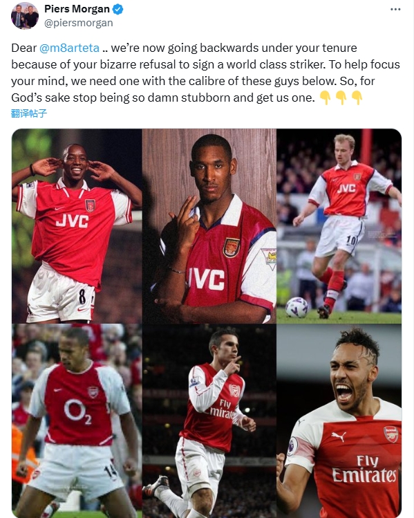 摩根曬亨利、博格坎普等人照片寫到:“親愛的阿爾特塔,我們?cè)谀愕膱?zhí)教下正在倒退,因?yàn)槟隳鼐芙^簽下一位世界級(jí)前鋒。為了幫助你專注,我們需要一個(gè)有下面這些人能力的球員。因此,看在上帝的份上,別這么固執(zhí),給我們找一個(gè)吧?!?/p>