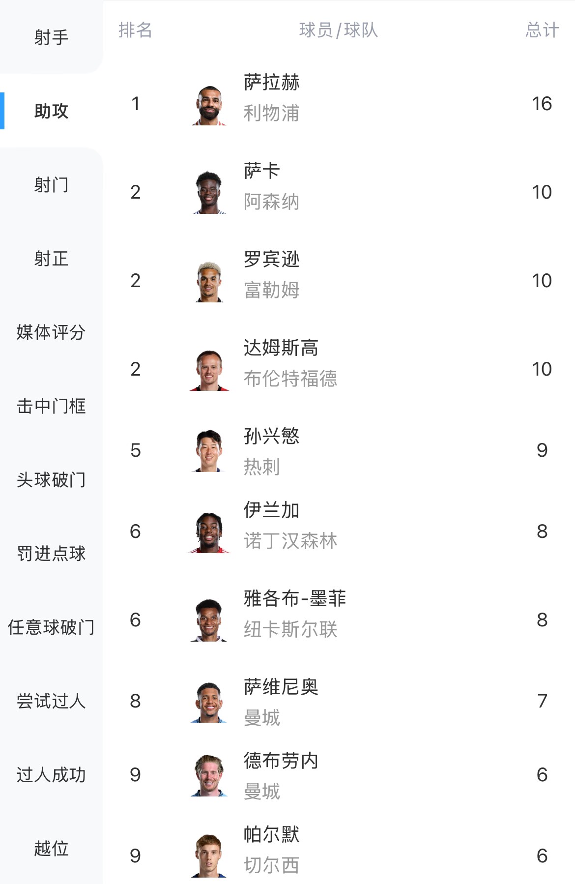 薩拉赫目前以25球領(lǐng)跑射手榜,領(lǐng)先哈蘭德和伊薩克6球。助攻榜上,薩拉赫16助領(lǐng)跑,領(lǐng)先薩卡等人6個(gè)。