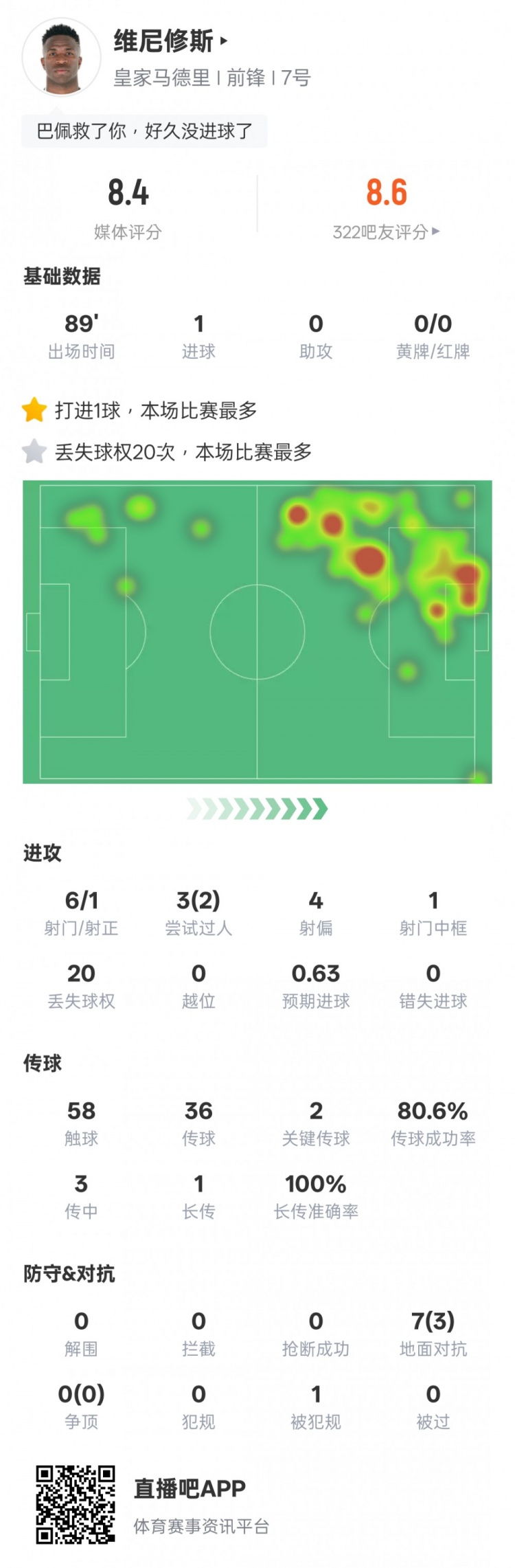 維尼修斯本場比賽數(shù)據(jù)如下: