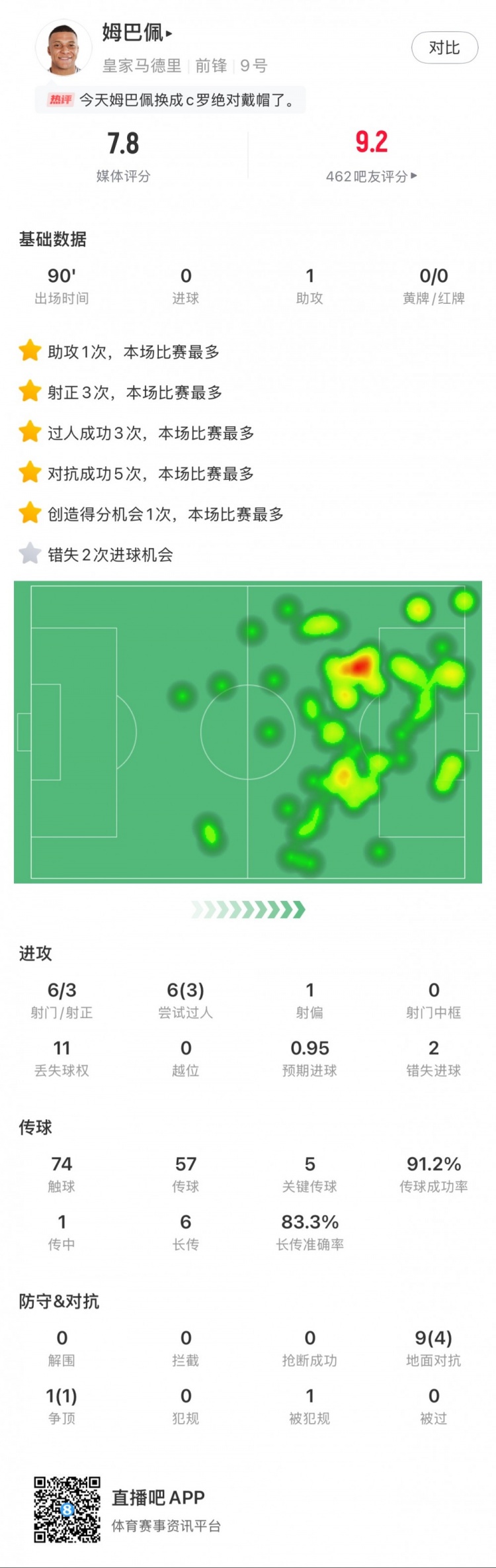 2月24日訊 本輪西甲,皇馬2-0赫羅納。姆巴佩全場(chǎng)數(shù)據(jù):