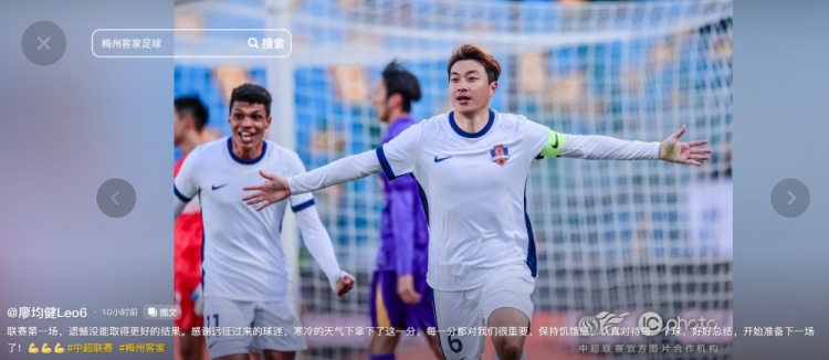 2月24日訊 中超聯(lián)賽首輪,梅州客家客場2-2遭天津津門虎絕平。賽后,梅州客家隊長廖均健在個人社交媒體中談到了感受。