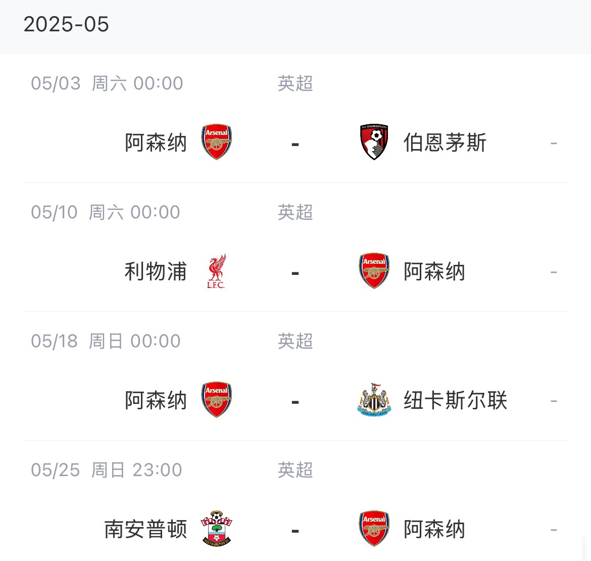 阿森納還剩12輪英超,接下來他們將先后對陣森林、曼聯(lián)和切爾西,5月中旬需連戰(zhàn)利物浦和紐卡。歐冠1/8決賽阿森納將對陣埃因霍溫,足總杯和聯(lián)賽杯他們均已出局。