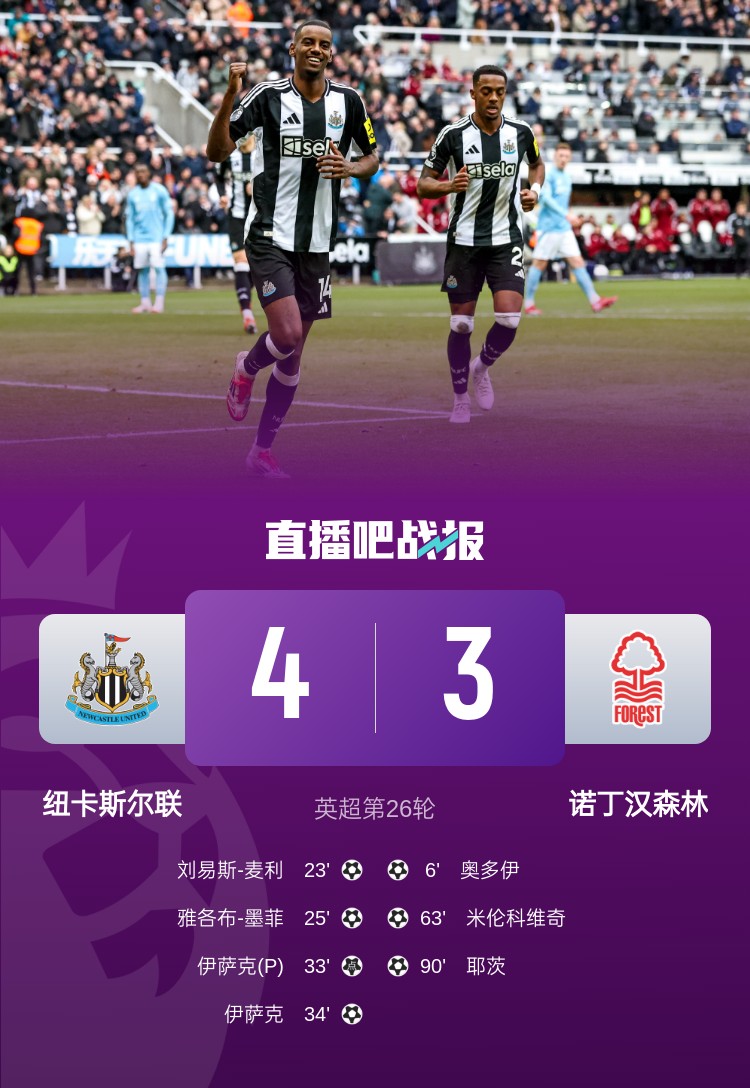 英超第26輪,紐卡4-3諾丁漢森林。上半場,奧多伊前場斷球后轟出世界波破門,麥利和墨菲3分鐘內(nèi)連進(jìn)兩球,埃納手球送點,伊薩克點射得手,隨后他梅開二度;下半場,沙爾頭球中柱,米倫科維奇蝎子擺尾扳回一球,耶茨補時階段再追一球。