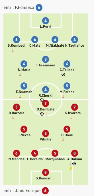 前鋒:巴爾科拉5分、登貝萊7分、克瓦拉茨赫利亞7分