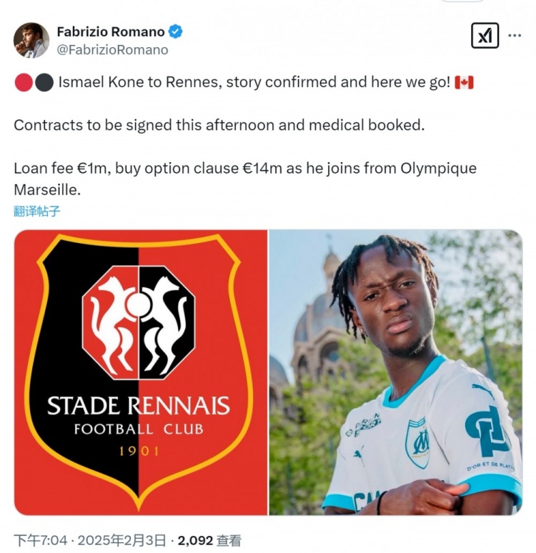 2月3日訊 據(jù)知名記者羅馬諾透露,馬賽中場伊斯梅爾-科內(nèi)租借加盟雷恩,Here we go!