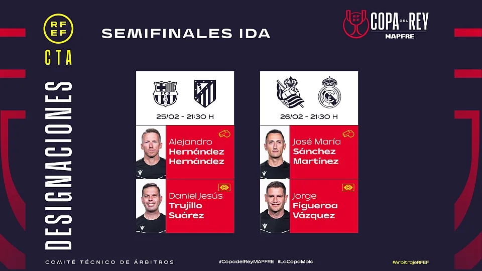 2月25日訊 西班牙足協(xié)日前公布了國王杯兩場半決賽首回合的裁判名單,具體如下:
