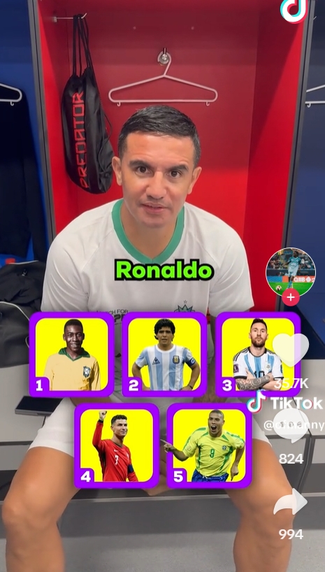 蒂姆-卡希爾的選擇是貝利、馬拉多納、梅西、C羅和羅納爾多。