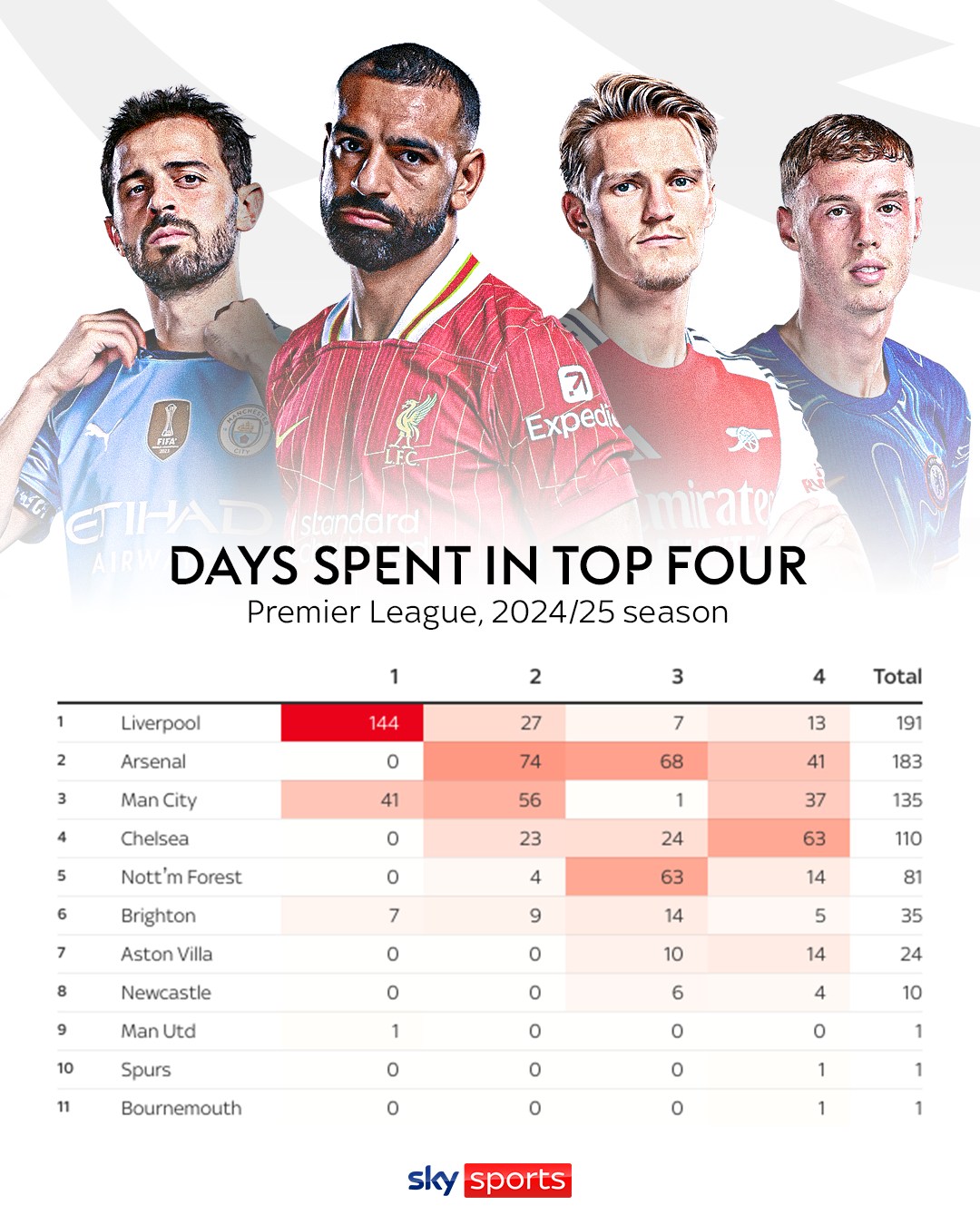 02月26日訊 天空體育統(tǒng)計了本賽季英超前四排名情況,利物浦排名榜首已有144天。