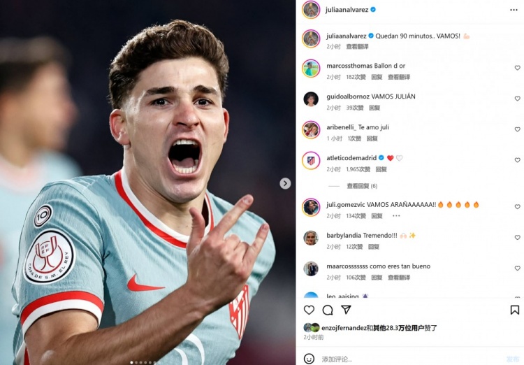 2月26日訊 在本輪國王杯,馬競4-4逼平巴薩。本場比賽阿爾瓦雷斯一傳一射表現(xiàn)出色,賽后他也在個(gè)人社媒曬出本場慶祝進(jìn)球的照片,配文寫道:“還有90分鐘比賽,我們繼續(xù)加油!” 標(biāo)簽: 足球 西甲 馬德里競技