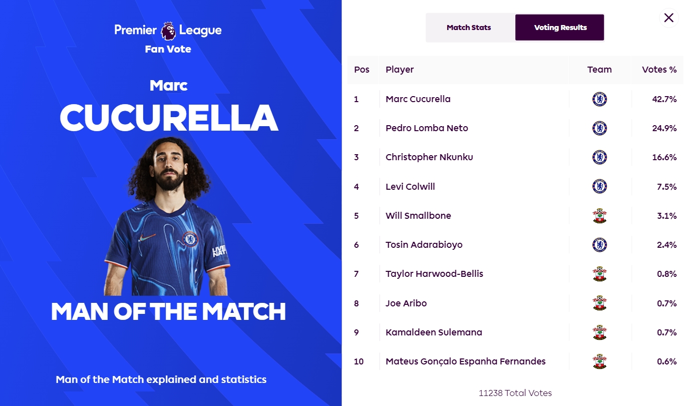 2月26日訊 本輪英超,切爾西主場4-0戰(zhàn)勝南安普頓。此役庫庫雷利亞發(fā)揮出色,以42.7%的得票率當(dāng)選全場最佳球員。