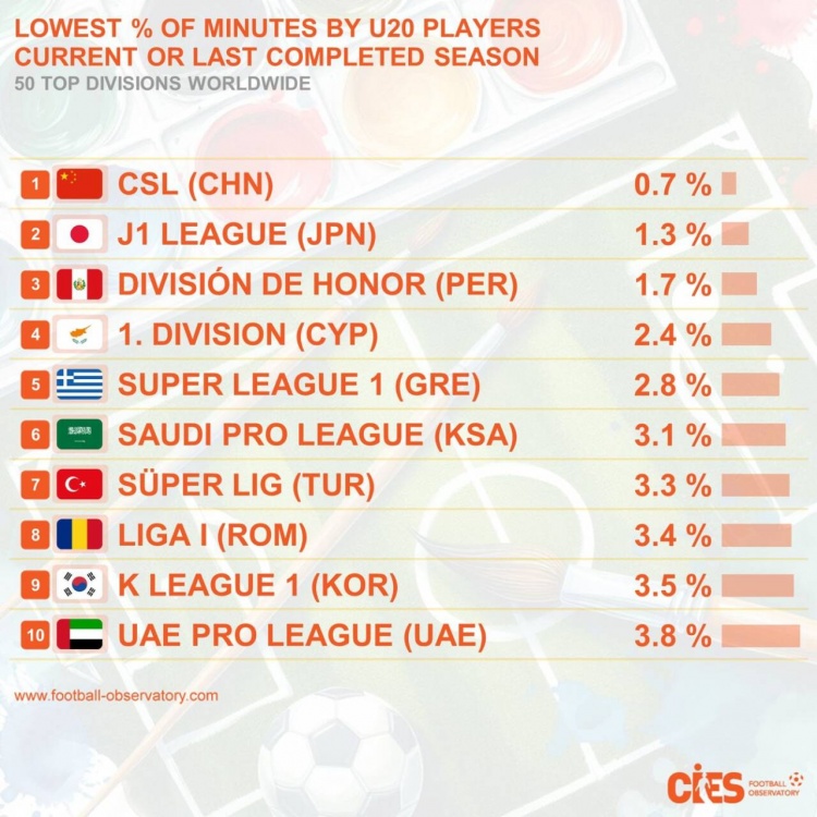 CIES統(tǒng)計(jì)數(shù)據(jù)基于當(dāng)前賽季(非跨年賽事如中超則為2024賽季)出生于2004年以后的球員在所有比賽出場時間百分比。中超以0.7%排在“第一”,日本J聯(lián)賽、秘魯聯(lián)賽緊隨其后,沙特、韓國等聯(lián)賽同樣榜上有名。