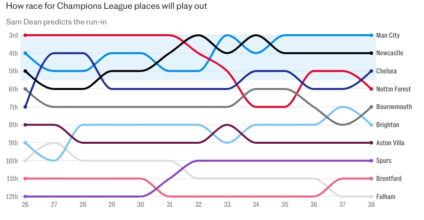 02月26日訊 英超有望在下賽季獲得5個歐冠席位,《每日電訊報》撰文對最后排在前5的球隊進行了預(yù)測。曼城、紐卡、切爾西將排在三四五名。