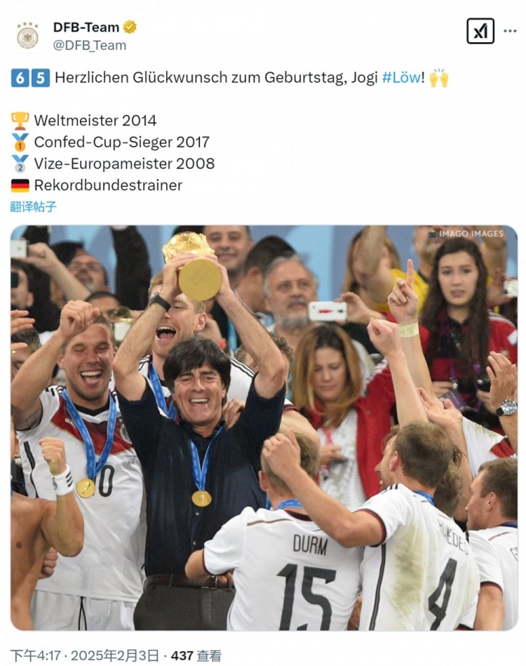 德國隊(duì)官方社媒曬出勒夫舉起大力神杯的照片,配文:“65歲生日快樂,勒夫!2014年世界杯冠軍、2017年聯(lián)合會杯冠軍、2008年歐洲杯亞軍、國家隊(duì)教練紀(jì)錄(執(zhí)教場次)!”