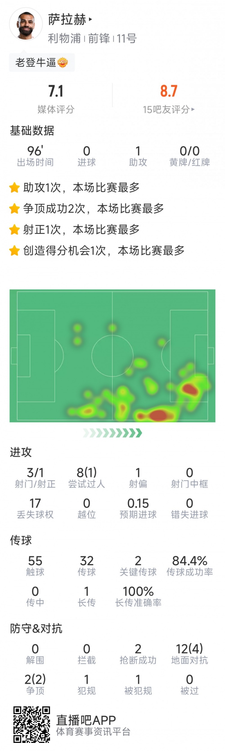 2月27日訊 在本輪英超,利物浦2-0擊敗紐卡,以下為薩拉赫本場(chǎng)數(shù)據(jù):