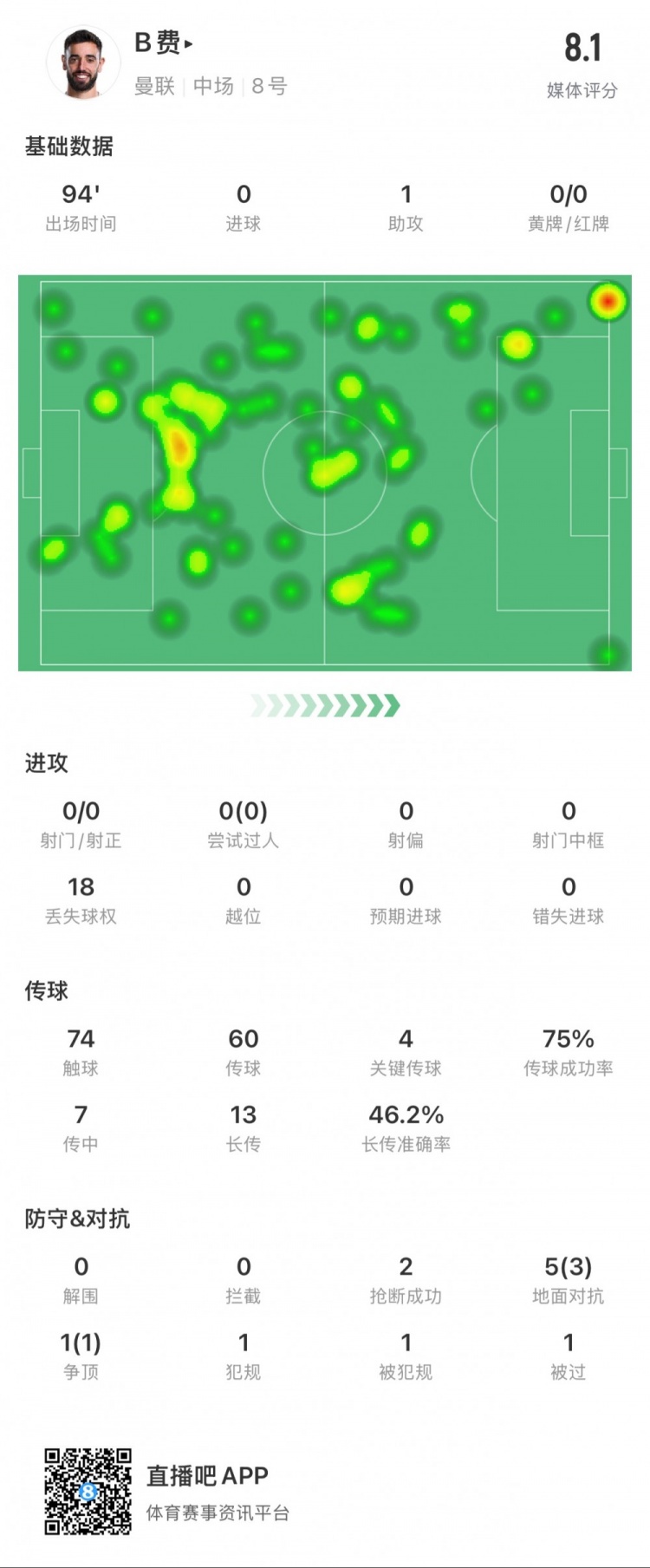 2月27日訊 本輪英超,曼聯(lián)3-2伊鎮(zhèn)。B費全場數(shù)據(jù):