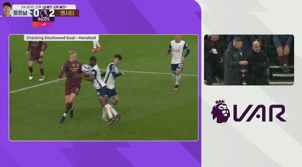 2月27日訊 英超第27輪,熱刺vs曼城。比賽補時階段,哈蘭德破門!隨后VAR介入,哈蘭德、丹索均有手球嫌疑,最終進(jìn)球被判無效!