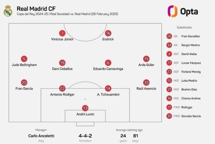 2月27日訊 國(guó)王杯半決賽首回合皇馬對(duì)陣皇家社會(huì)的比賽即將開(kāi)始,雙方首發(fā)陣容公布。