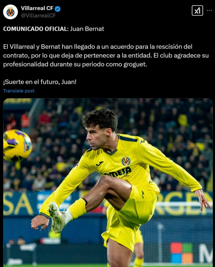 2月4日訊 比利亞雷亞爾官方宣布,俱樂(lè)部和貝爾納特已經(jīng)達(dá)成協(xié)議,將提前終止他的租借合同,這意味著貝爾納特將不再是俱樂(lè)部的球員。