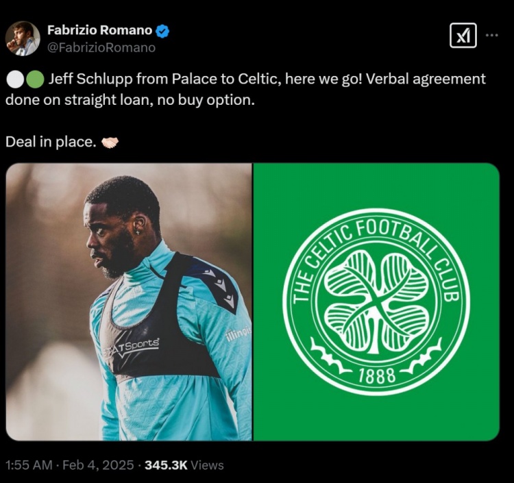 2月4日訊 名記羅馬諾用標(biāo)志性的here we go確認,水晶宮中場施魯普將以租借形式加盟凱爾特人。