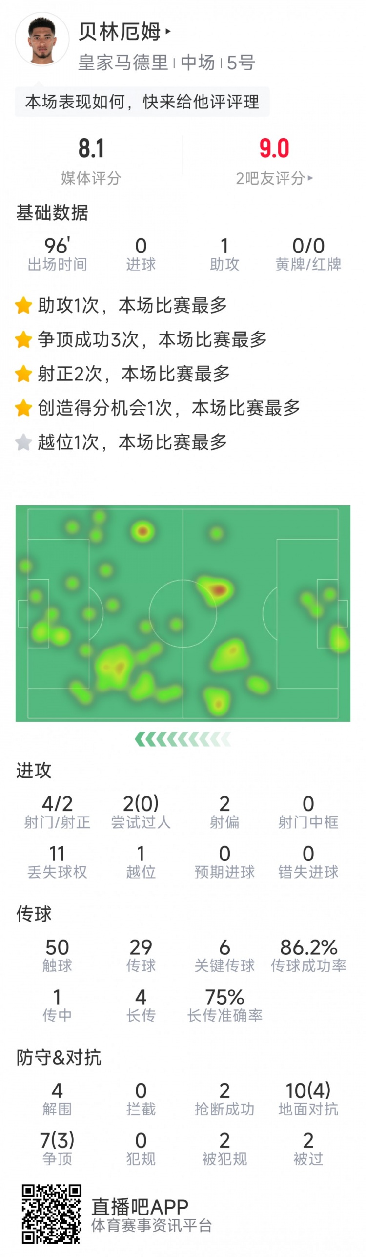 貝林厄姆本場數(shù)據(jù):1次助攻,6次關鍵傳球,4射2正