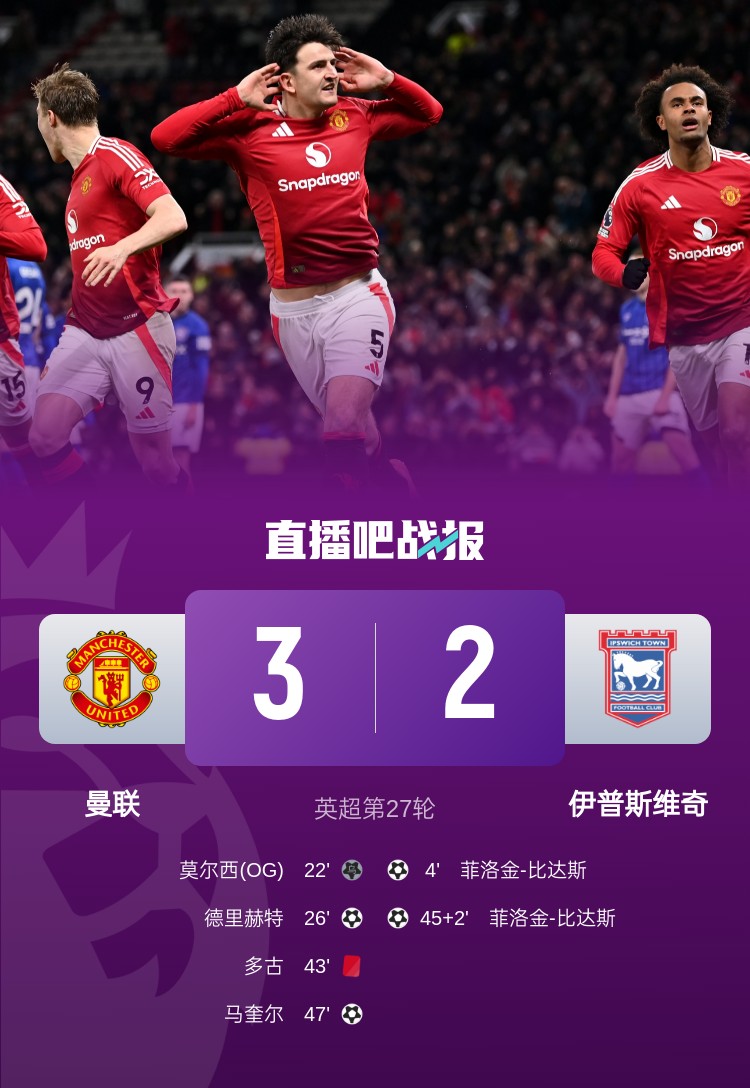 多古送禮+染紅,馬奎爾頭球破門,曼聯(lián)3-2逆轉(zhuǎn)伊普斯維奇。