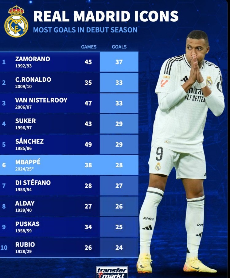 皇馬隊(duì)史首秀賽季進(jìn)球榜:薩莫拉諾37球居首,姆巴佩28球第6