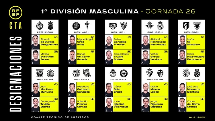 2月27日訊 本周末,西甲第26輪將拉開戰(zhàn)幕,西班牙足協(xié)官方公布了本輪比賽的裁判安排。埃爾南德斯執(zhí)法皇馬客戰(zhàn)貝蒂斯,昆特羅-岡薩雷斯主裁巴薩主場(chǎng)迎戰(zhàn)皇家社會(huì)。