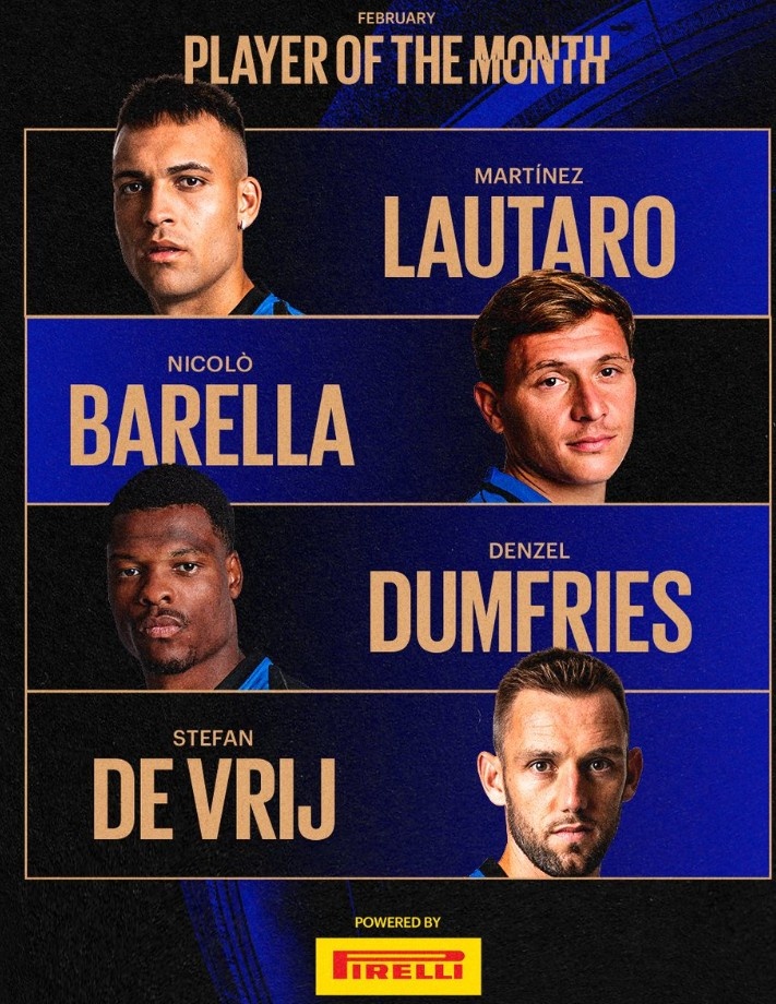 2月27日訊 國(guó)米官方評(píng)選出二月份隊(duì)內(nèi)最佳球員候選名單,勞塔羅、巴雷拉等人在列,具體如下: