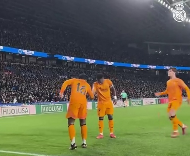 國王杯戰(zhàn)勝皇家社會(huì),恩德里克進(jìn)球后與維尼修斯握手慶祝