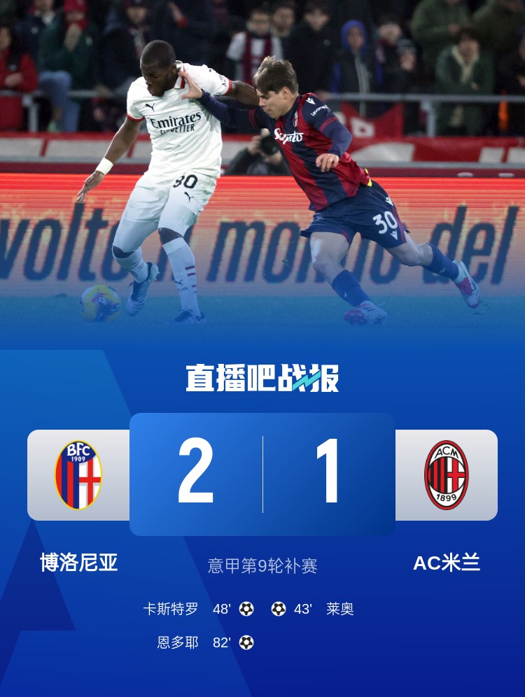 萊奧破門,米蘭1-2遭博洛尼亞逆轉(zhuǎn),意甲兩連敗跌至第8名。