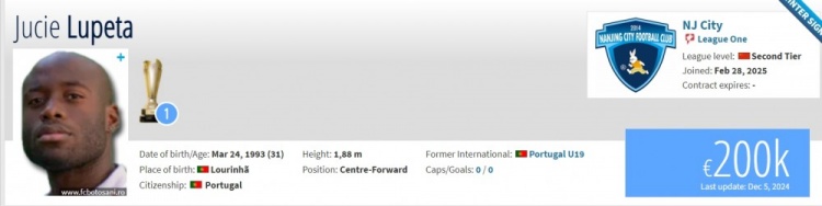 根據(jù)德轉(zhuǎn)信息,盧佩塔以自由轉(zhuǎn)會(huì)的方式加盟南京城市,他目前的身價(jià)為20萬歐。