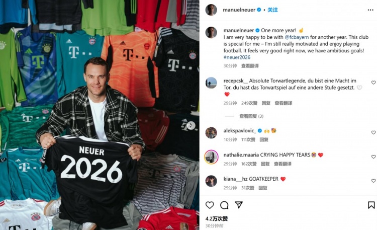 諾伊爾曬出站在自己的歷年拜仁球衣墻前并手持印有2026字樣的拜仁球衣的照片,他也表示:“再續(xù)一年!”