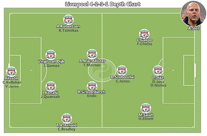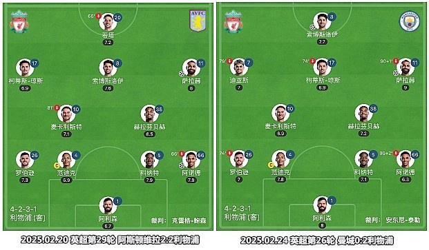 四天內(nèi)兩戰(zhàn)強敵,利物浦的首發(fā)陣容只有1處變化,斯洛特使用了兩種截然不同的陣型和打法。
