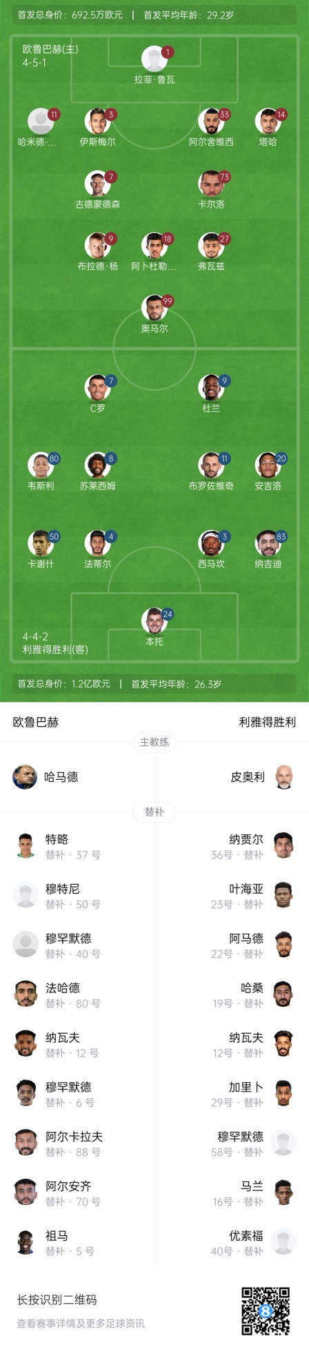 3月1日訊 沙特聯(lián)第23輪 歐魯巴赫主場迎戰(zhàn)利雅得勝利,賽前首發(fā)名單公布。