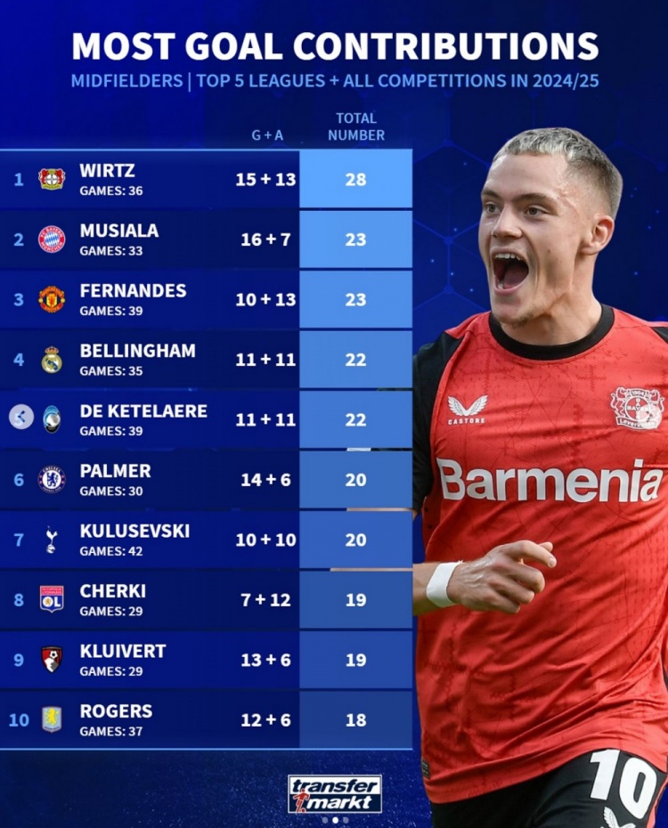 3月1日訊 德轉(zhuǎn)盤點了本賽季五大聯(lián)賽中場球員在各項賽事中參與進(jìn)球榜,其中維爾茨居首,穆西亞拉次席,以下為具體榜單: