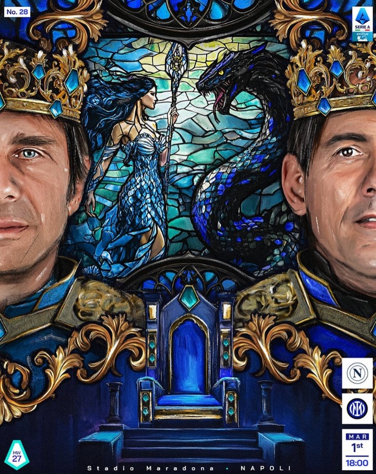 3月1日訊 本輪意甲將迎來國米與那不勒斯的焦點對話,意甲官方也曬出海報為本場比賽預熱,海報中的主角是兩隊主帥孔蒂、小因扎吉,兩人頭戴王冠爭奪王位。