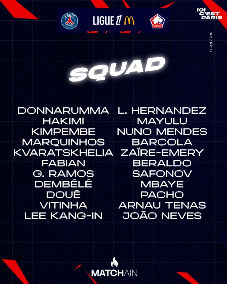 巴黎vs里爾大名單: