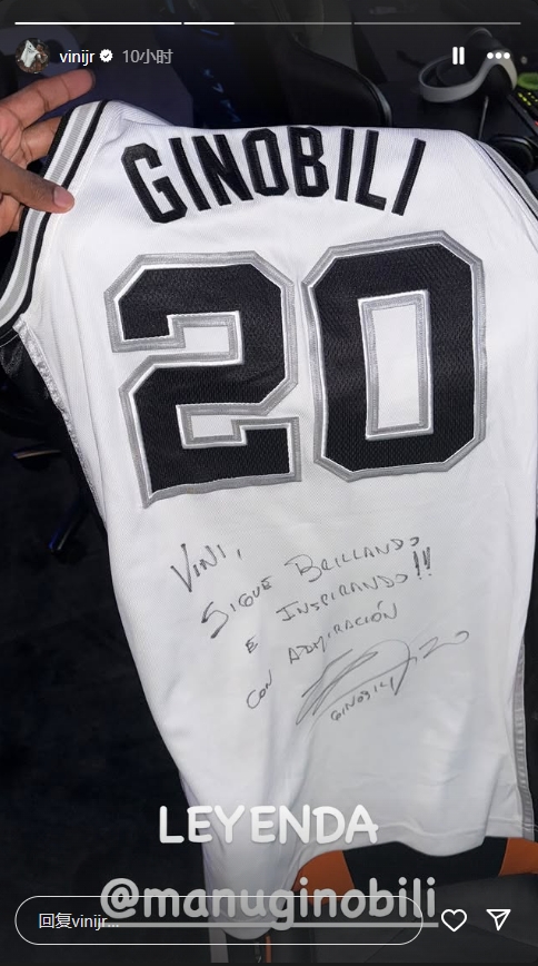 3月1日訊 皇馬球星維尼修斯社媒更新,曬出了阿根廷籃球巨星、NBA馬刺隊名宿吉諾比利的簽名球衣。